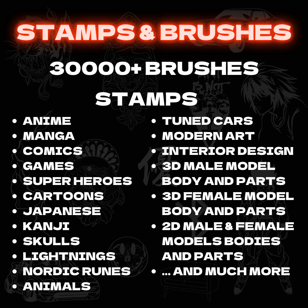 Inside each Pack you’ll find a complete set of Brushes, Stamps, Textures, ready-to-use design elements.